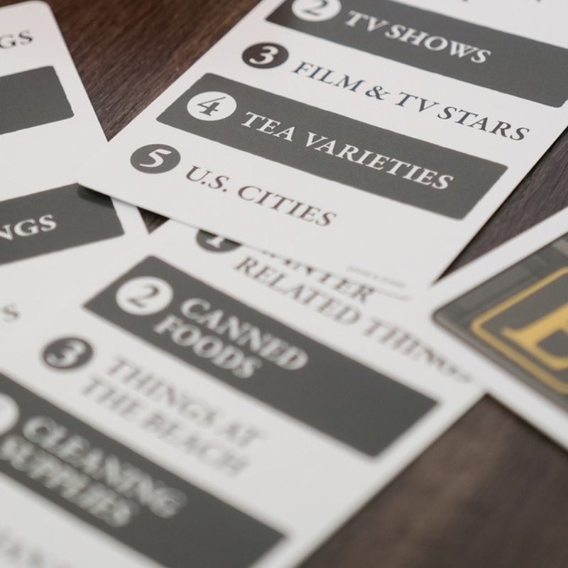 Start by drawing a Category Card and a Letter Card. Then set a 60-second timer and start shouting! The goal is to shout a word that fits the Category Card and starts with one of the letters on the Letter Card. When you’ve gotten the word, flip a new Letter Card. Repeat this chaotic process until time, or your vocal cords run out.