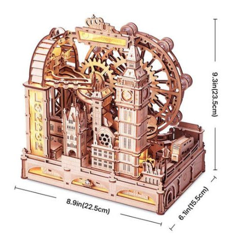 Construct London's famous attractions like the London Eye, Big Ben, and the Tower Bridge with this DIY 3D wooden puzzle marble run, then travel through them in a speedy, adrenaline-filled journey.