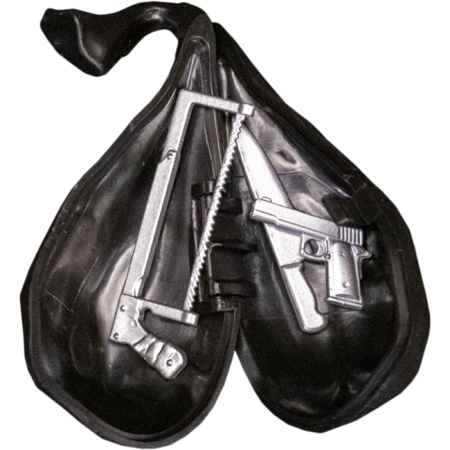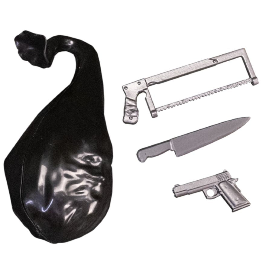 The figure comes complete with his trash bag of terror to hold his 3 weapons of choice: a pistol, a knife, and his trusty hacksaw!