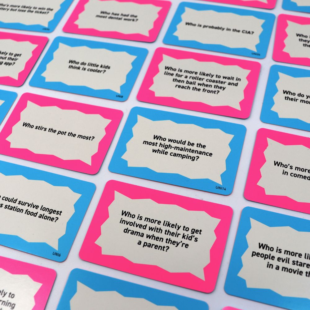 You’ll come up against loads of tricky questions, such as “Who’s more golden retriever?” and “Who’s more likely to join a cult for the free food?”.